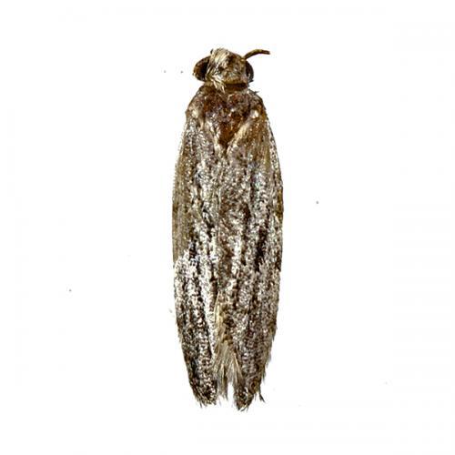 | Adulto | 15 mm (env. alar) | Alas anteriores prácticamente rectangulares, grises con franjas más oscuras. Las posteriores son grises, con forma de tejadillo estando en reposo. |