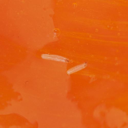 | Larva | 6-9 mm | Es un "gusano" de color crema, sin patas, con la cabeza muy pequeña y el extremo anterior del cuerpo más estrecho que el posterior. |